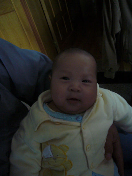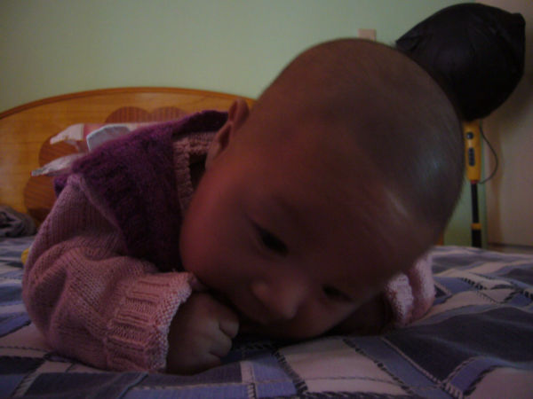 第二张是我趴在床上的照片,可爱吧,我真是想往前爬啊,可是腿上没劲,我吃奶的劲都用出来了,还是爬不动。