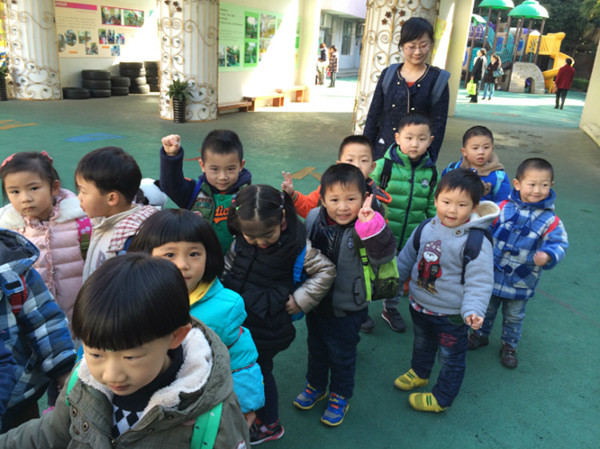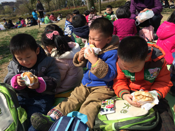 第三张,是我最喜欢的,大家一起吃幼儿园发的汉堡。真好吃。