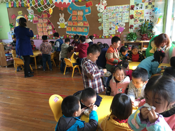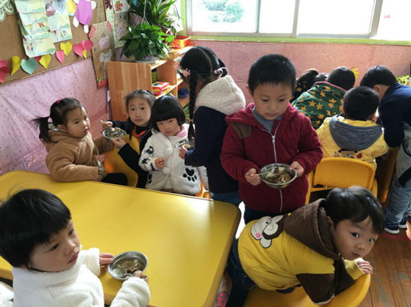 在大带小的活动中,大班小朋友以班级为单位,每人认领了一个小班幼儿作为自己的弟弟或妹妹,而且用各自不同的方式表现自己对小班弟弟、妹妹的关爱、安抚。午睡时,大哥哥大姐姐来到寝室为弟弟妹妹们穿鞋,整理床铺,搀扶着他们下楼;午餐后,细心的小姐姐们还为弟弟妹妹们擦擦小嘴,使得小班的小宝贝们原本淌着泪水的小脸一下转成了晴天,露出灿烂的笑容。