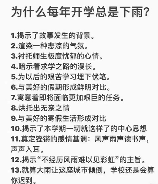 而且,上学期由于疫情,没有期末考试就提前放假了,但考试是跑不掉的,这个月14、15号,我们就要进行上学期的期末考试了,这又是一个令人伤心的消息。所以,我的心情就和今天的天气一样,雨下得停不下来。