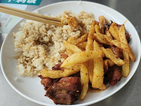 到了初三,我们就可以在食堂里选择自己喜欢吃的东西了,因此第一天,我就选择了看上去挺不错的鸡肉薯条饭套餐,价格嘛,稍微贵了一点,14块钱。还别说,自己选的饭菜吃起来就是香,除了稍微辣了一些。