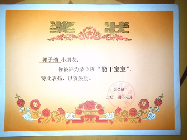 好了,直接揭晓答案了,我得的是“能干宝宝”的奖状,我觉得这个还是挺符合我的,因为我是非常能干的嘛。当然了,有奖状自然就有奖品了,我的奖品是一把尺。虽然不是很值钱,但毕竟是我在幼儿园拿的第一个奖品呢,我一定要好好的珍藏。