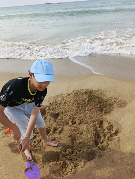 对我来说,来三亚最最重要的就是在海边挖沙子,所以这次我们特意住在了亚龙湾。每天一大早,趁着天还不是那么热,我们就可以到海边去挖沙子了。我喜欢把沙子堆得高高的,像城墙一样,这样即使有海浪过来,也不能把我们堆的“城墙”给冲塌了。吹着海风,和大自然抗衡,可有成就感了。